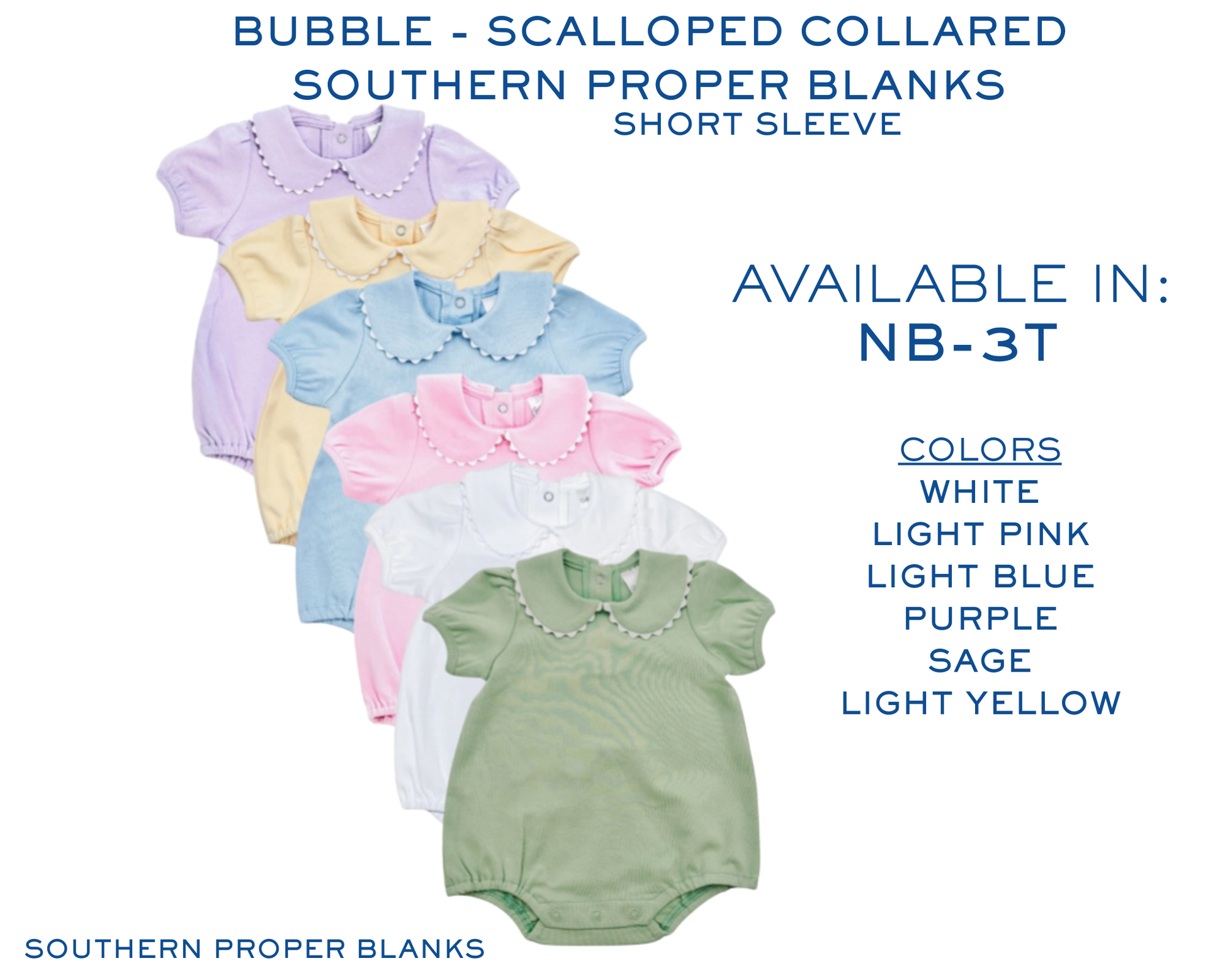 Our Bubble Scalloped Collared Short Sleeve from Southern Proper Blanks is a timeless baby staple, perfect for classic and personalized embroidery. Featuring a sweet scalloped collar and soft fabric, this piece is ideal for names, initials, simple designs, or appliqué embroidery.
