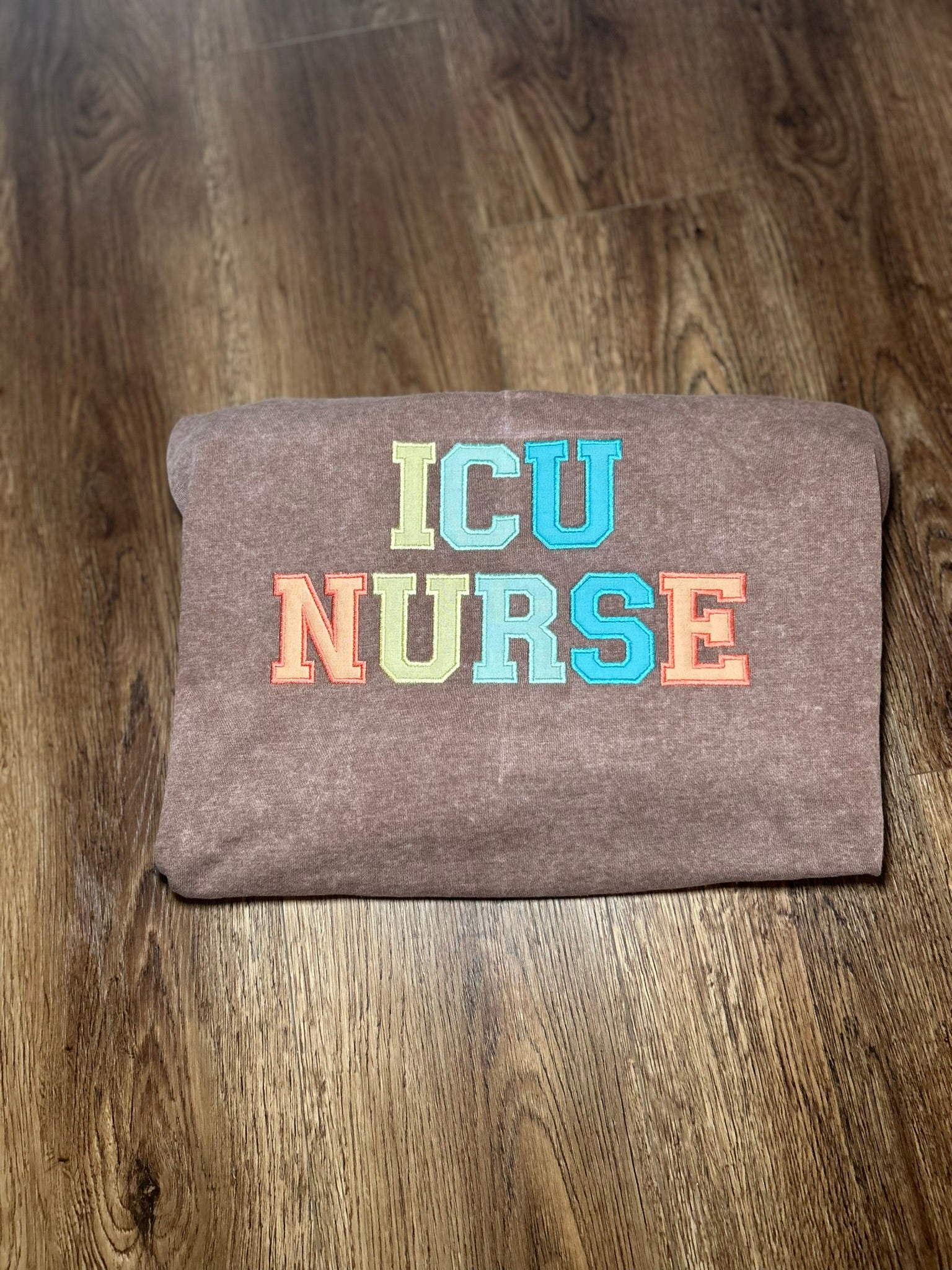 Stay cozy while repping your specialty đź’™ This embroidered ICU Nurse sweatshirt features soft pastel varsity-style lettering stitched for a timeless, elevated look. Perfect for long shifts, study days, or off-duty comfort.