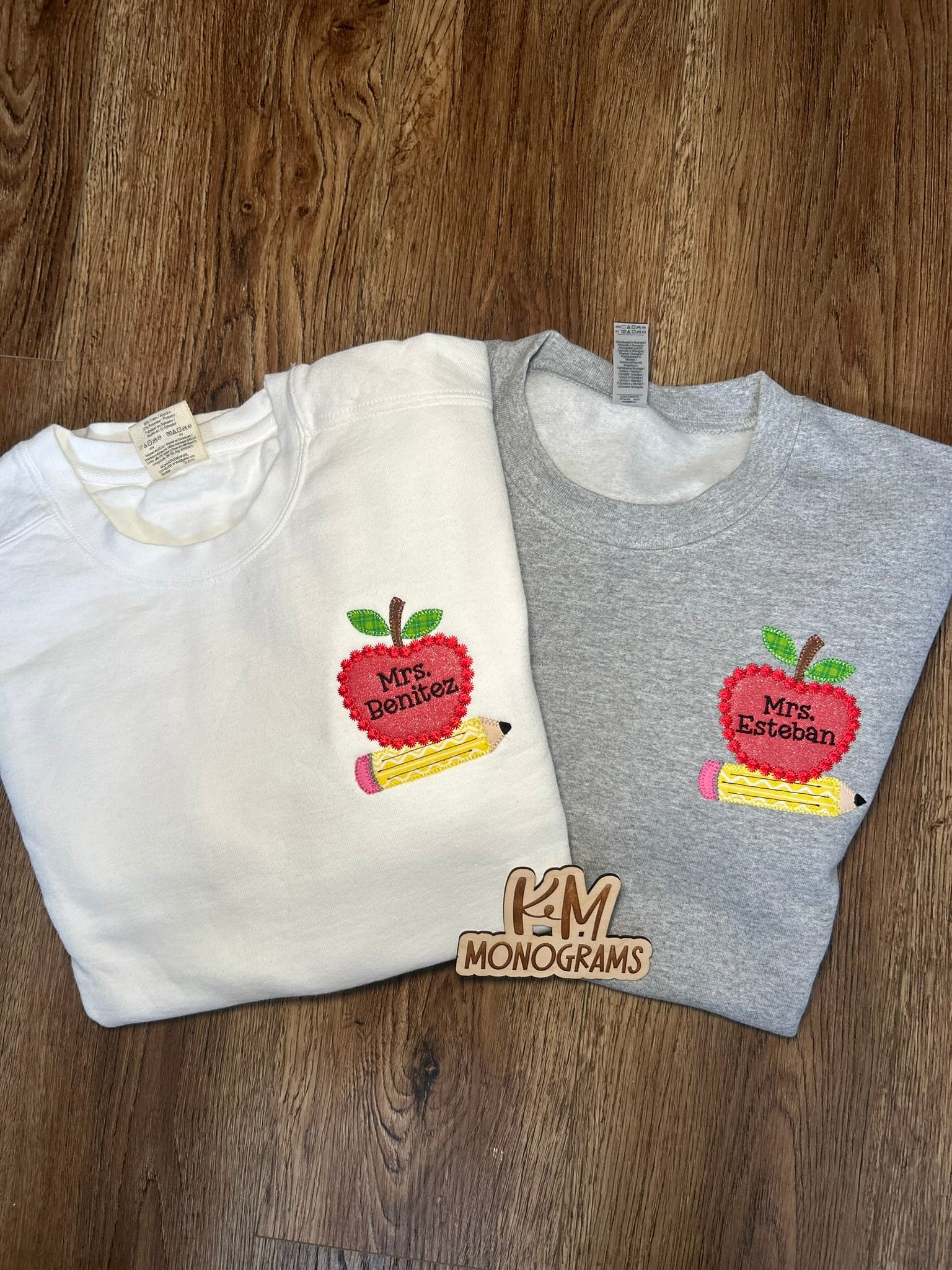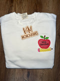 This custom embroidered sweatshirt features an adorable appliqué apple and pencil design, personalized with your name for the perfect classroom-ready look.